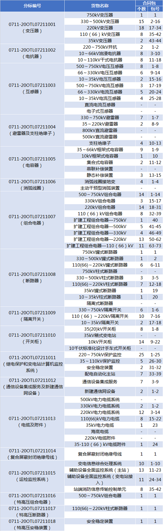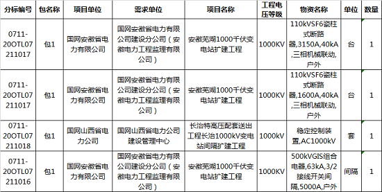 近日國家電網公司電子商務平臺發布了國家電網有限公司輸變電項目2020年第三次變電設備(含電纜)招標采購招標公告,招標編號:0711-20OTL072,涉及變壓器、電抗器、互感器、避雷器及支柱絕緣子、電容器、消弧線圈、組合電器、斷路器、隔離開關、開關柜、繼電保護和變電站計算機監控系統、通信設備集成服務及新建通信網設備、電纜及附件、復合屏蔽封閉絕緣母線、運檢監控系統、特高壓組合電器、特高壓斷路器、特高壓安穩裝置等物資。